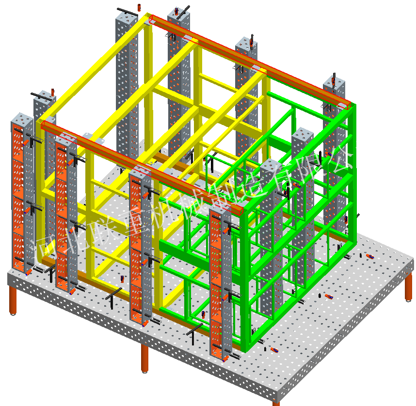 2、柔性化:柔性三維組合焊接工裝平臺的承載能力高,鋼性穩定,它的五個面均加工有規則的孔,并刻有網線。焊接平臺可方便地延伸和擴展,組合。經擴展的標準臺面可模塊化的定位和夾緊直接連接在一起。在安裝、調整和定位工件過程將柔性三維組合焊接工裝系統的通用功能展示的,尤其在了大型工件方面的應用上。拼裝方式多樣,用戶只要充分發揮想象力,幾乎可達到任何夾具同樣的定位和夾緊功能。拼裝,裝拆方便;工作臺面可以根據工件形狀、大小進行拼裝組合。臺面上的刻度和模塊尺寸的設計,使操作工人不用量具就可以根據工件尺寸搭出所需要的工裝。